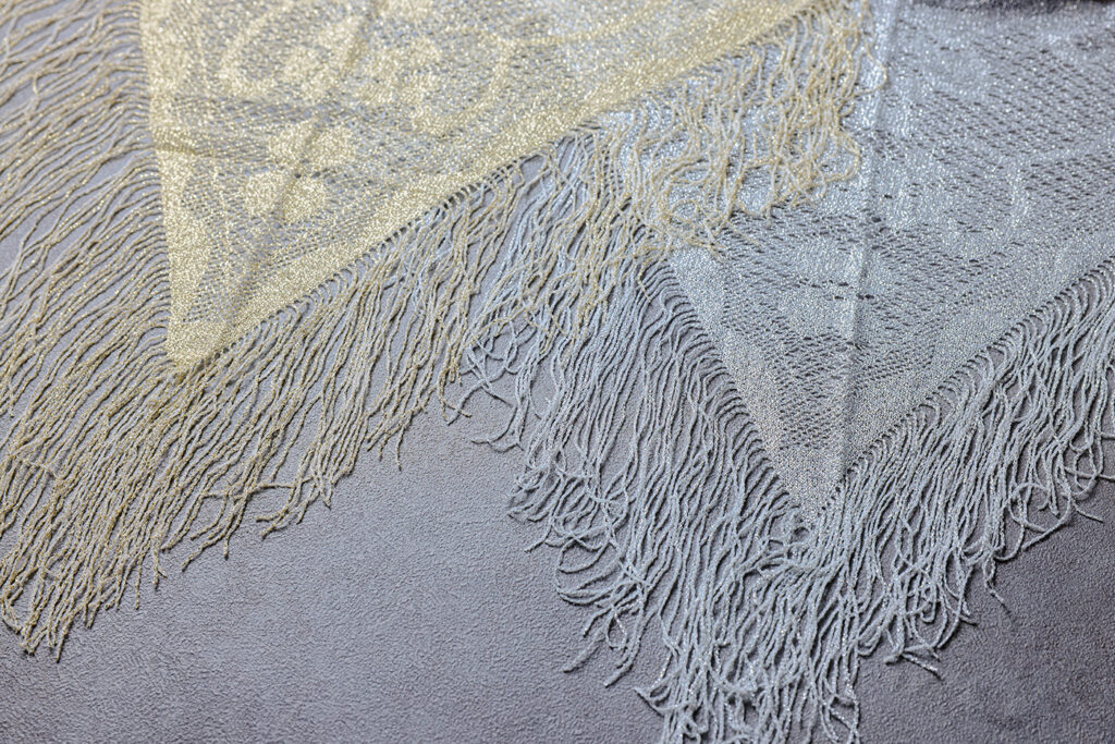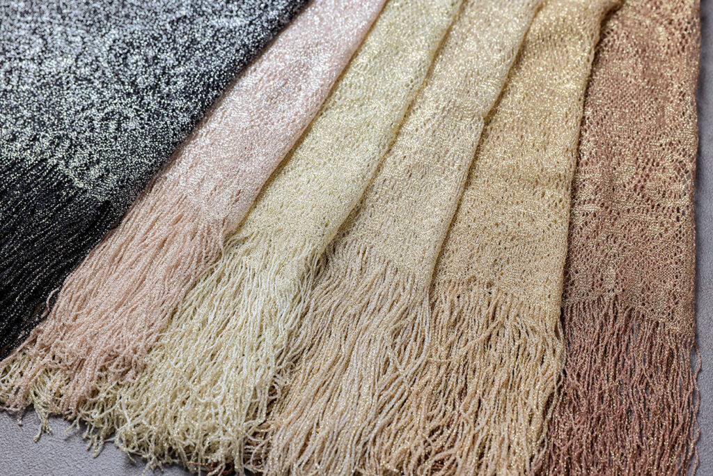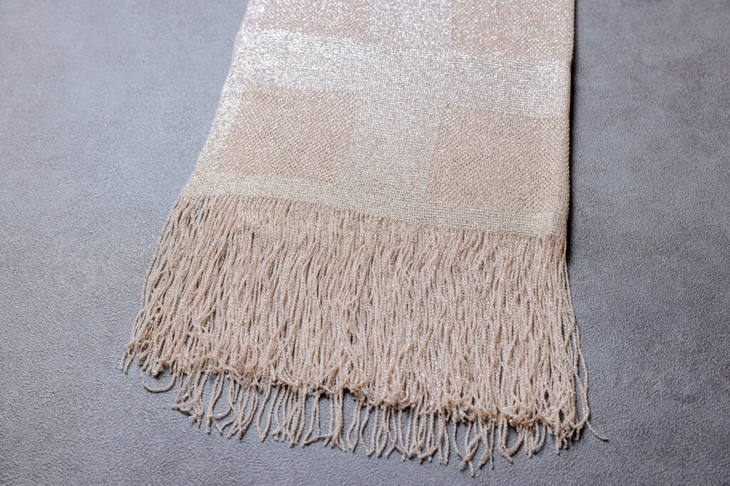 きらめく糸で編まれた繊細なスカラ柄ストールです。