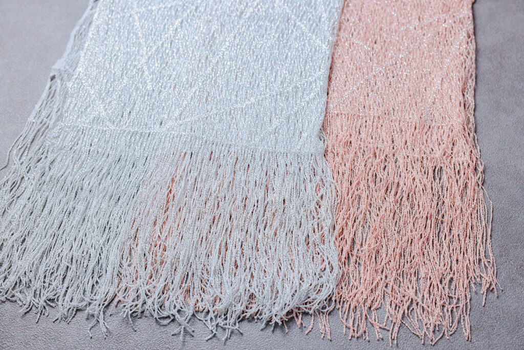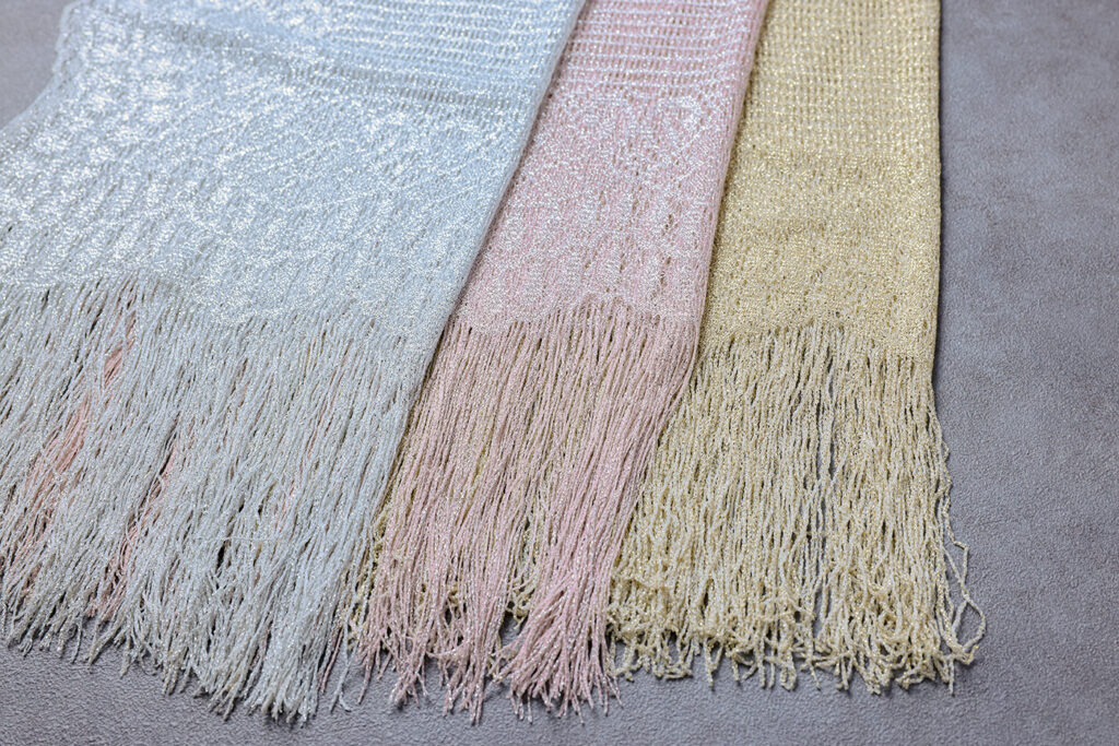 繊細な編み模様と上品なラメ感が魅力の華やかなストールです。