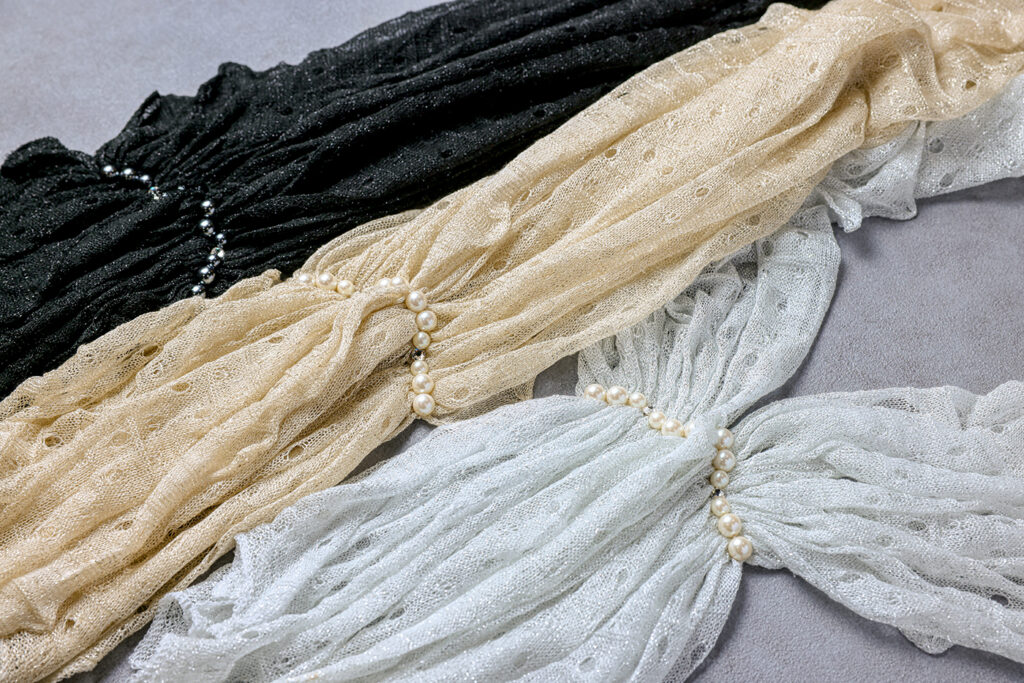 繊細なトーションレース+箔シフォン 軽やかな透け感が装いに華を添えます。