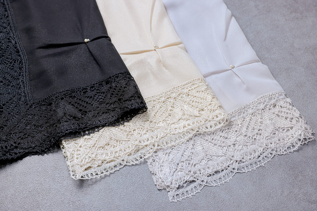繊細なペイズリー柄のレースが、上品に映えるエレガントなストールです。