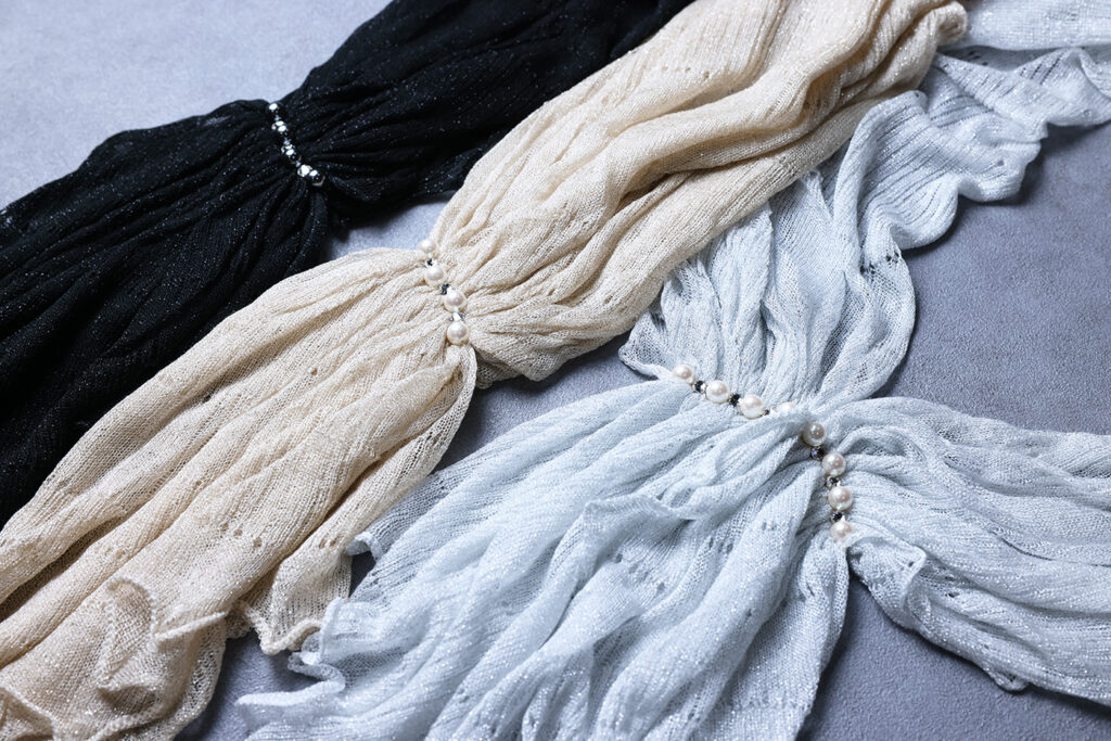 柔らかいラメ素材をピンタックで美しく寄せた華やかなストールです。